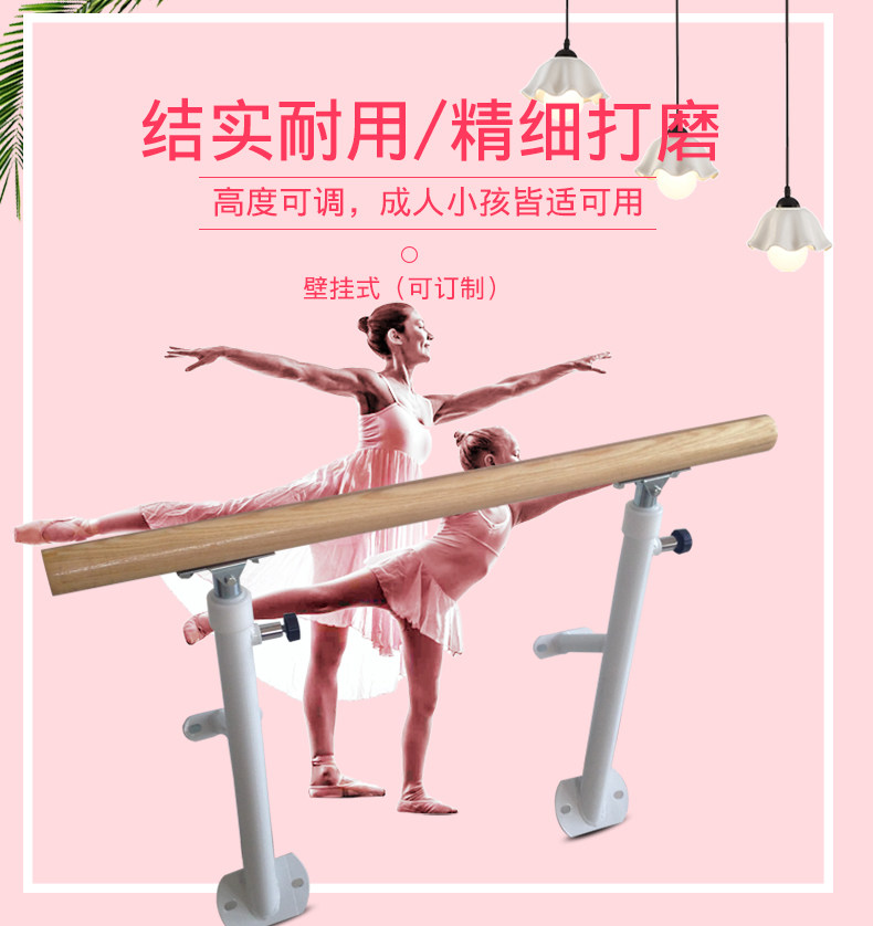 辽宁锦州壁挂式舞蹈把杆价格厂家专业移动式舞蹈把杆,是用于舞蹈教学中压腿、舒展肢体、气息、力量、稳定性和身体柔韧性等全方位综合练习的专业练功支架,它可以帮助练习者完成动作时调整重心,掌握平衡,好的舞蹈把杆在舞蹈练习中起着至关重要的作用。壁挂式舞蹈把杆:可直接斜插,有固定法兰用膨胀螺丝固定与墙面,内芯上将幅度35cm,最低点离墙面30cm,把杆升的越高 杆离墙面越远,把杆直经为5.5厘米,水曲柳材质,内有2.2cm直径锰钢.,长度也可根据客户要求定做。