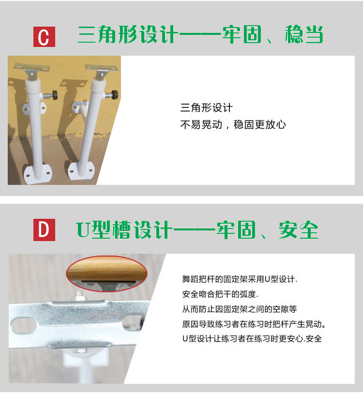四川成都悬挂式舞蹈把杆厂家壁挂式舞蹈把杆:可直接斜插,有固定法兰用膨胀螺丝固定与墙面,内芯上将幅度35cm,最低点离墙面30cm,把杆升的越高 杆离墙面越远,把杆直径55mm结合舞者多年使用反馈建议得出合理尺寸,练习舞蹈时手可以更好的握住把杆以防抓不牢摔伤杆芯采用22mm锰钢具有良好的弹性,使把杆不易压断经久耐用安全牢靠。把杆支架采用静电喷涂钢管需要抛丸除锈后喷上粉末在电烤箱里高温处理,与汽车工艺一样经久耐用色泽亮丽美观耐腐蚀防老化。