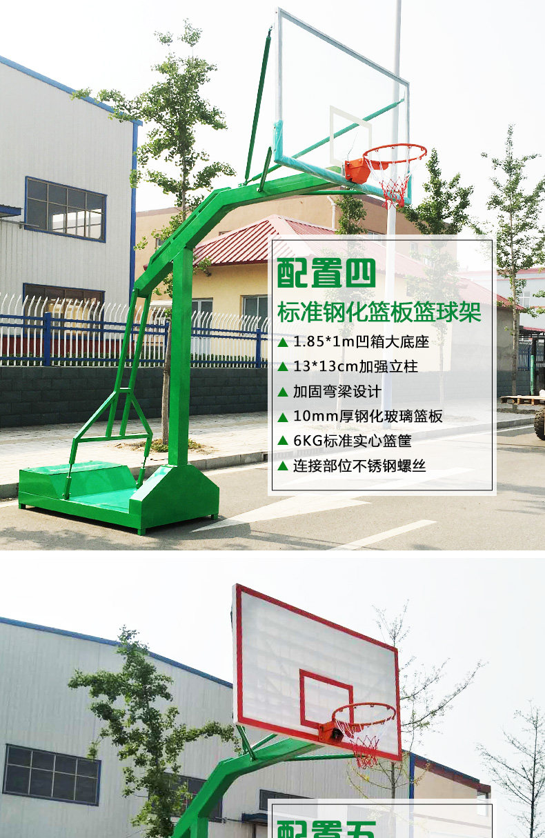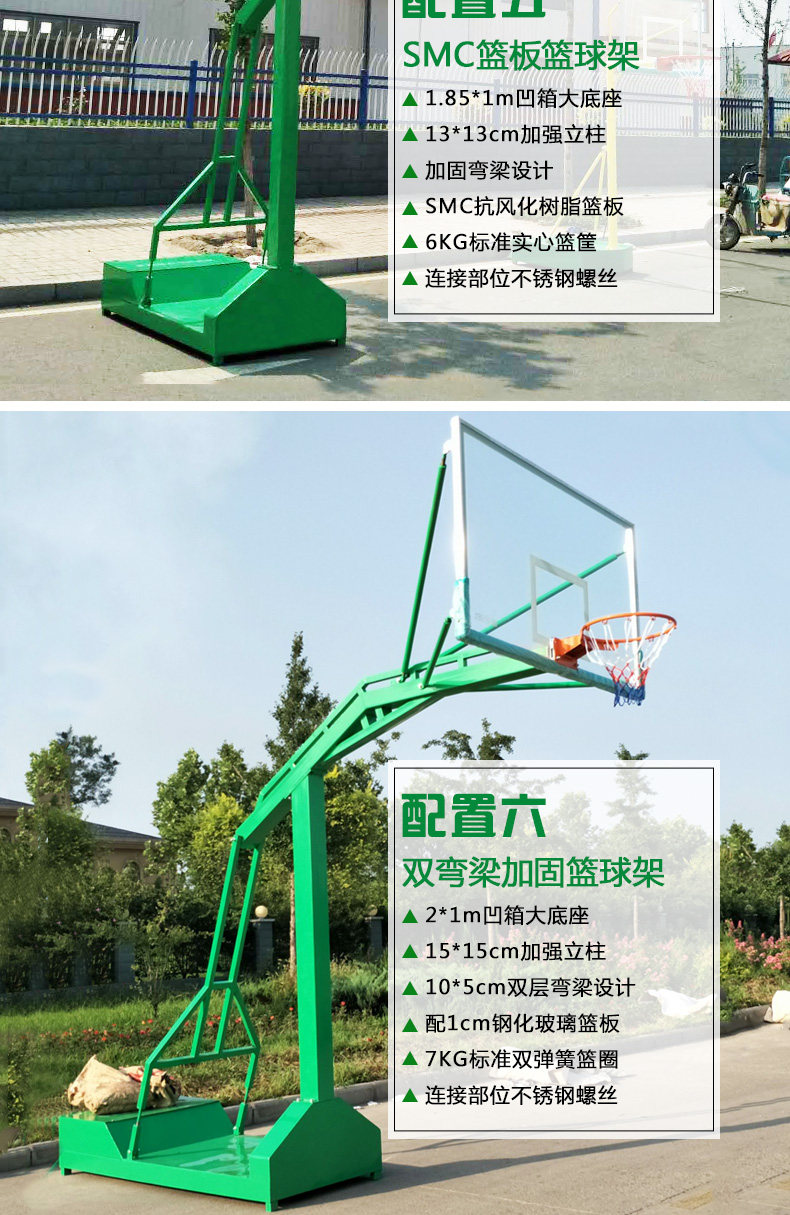 5、 篮球架上所具有的篮架拉杆采用优质镀锌圆管在弯管机上一次成型,避免了电焊及焊渣易引起生锈的隐患,合理的结构设计与独特的外观造型和谐统一;