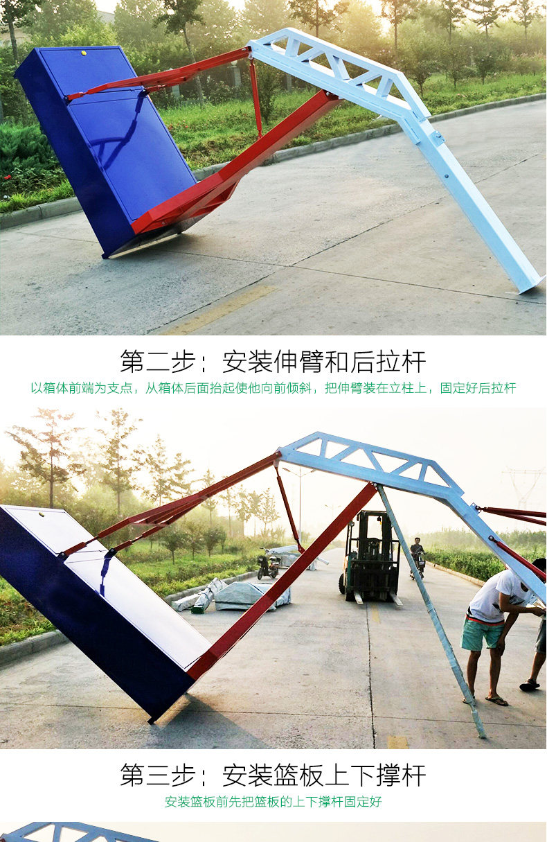 1.主立柱采用120×120㎜的方管,臂厚4.0㎜,伸臂1.8米和2.25米;2.后配重箱体尺寸是:1.8×1×0.4米,小方箱,内有水泥配重260公斤,单支篮球架总重量有360公斤;3.五支点连接方式连接牢固。