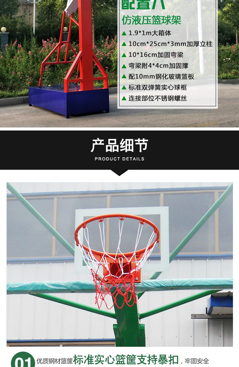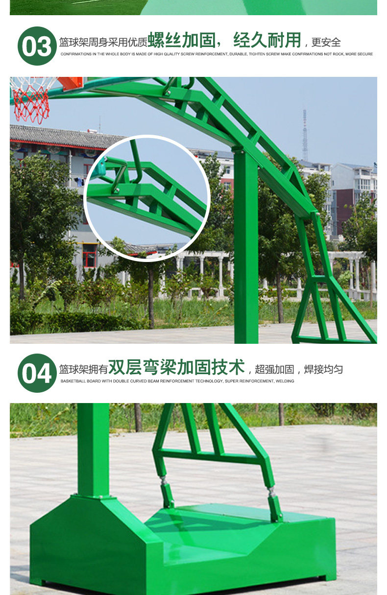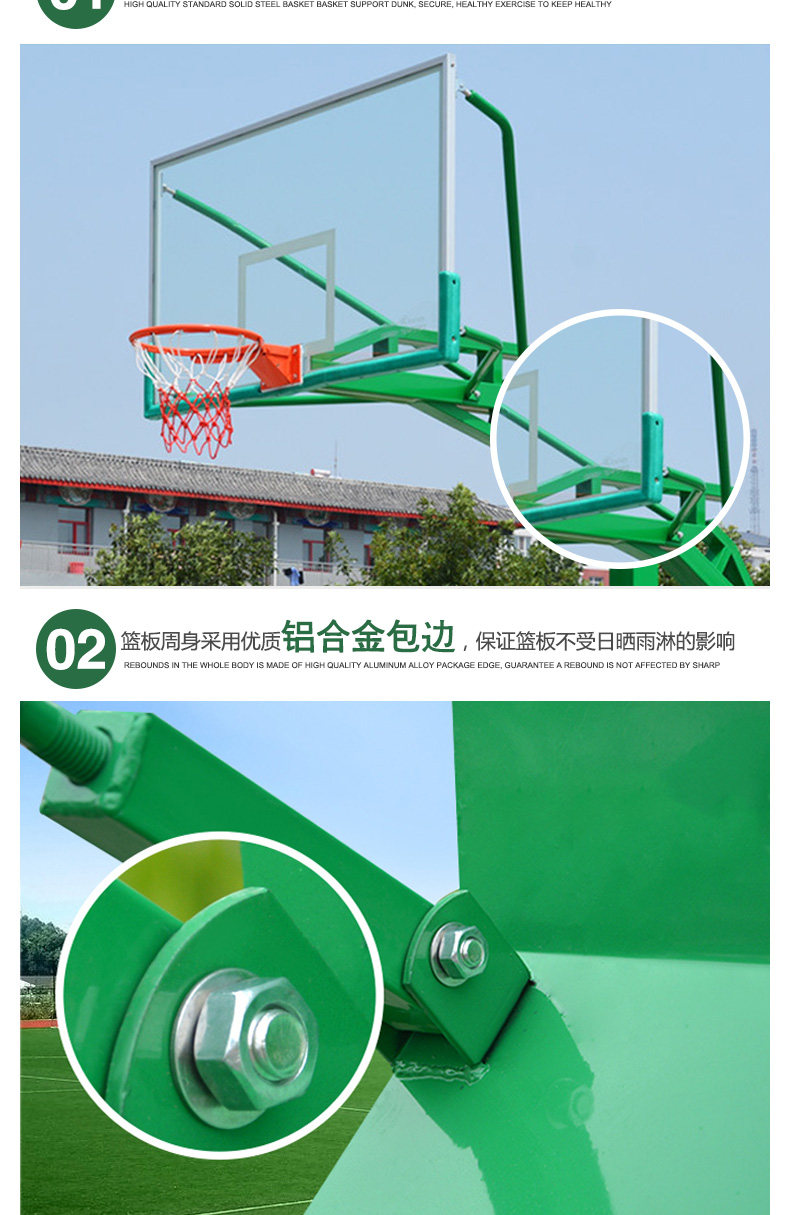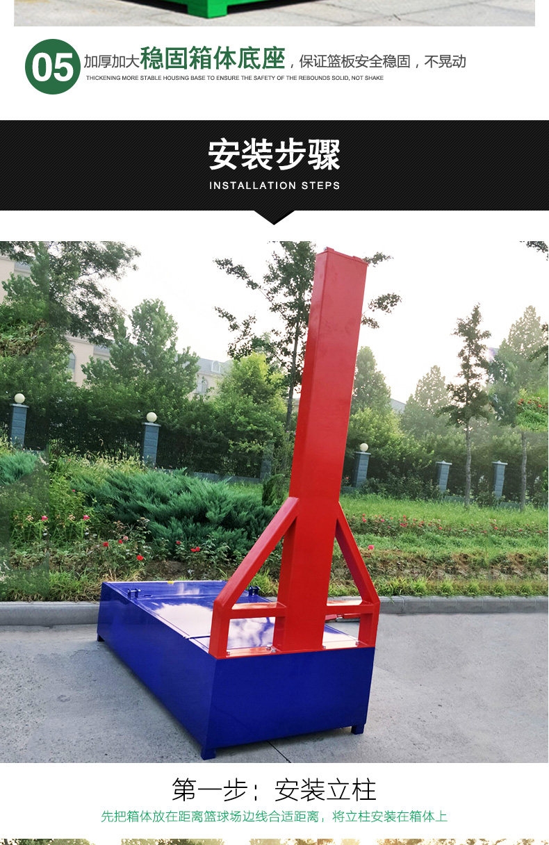 篮板:尺寸:1.8*1.05米为国际标准钢化玻璃材料制成,完全胜任灌篮和其他激烈的运动。的主杆:优质方形钢管直径为150(国际标准移动炮式篮球架的主杆直径为75)。篮球架的移动底箱:优质钢板制成,尺寸为:30(高)*100(宽)*180(长),移动底盒里装负重物,以保证在使用时的稳定性。篮球架的主杆与篮板之间的拉杆:两根优质圆形钢管与主杆形成三个三角型,保证篮板的稳定。