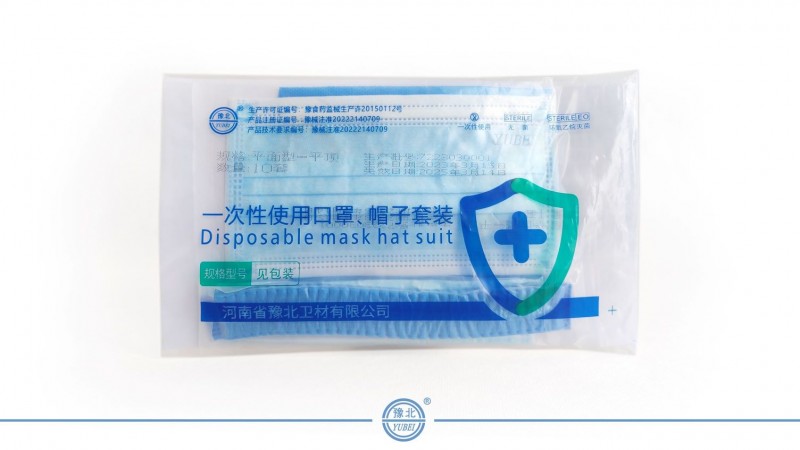 本产品为一次性使用口罩帽子套装,包含医用级防护口罩一顶和一次性帽子一顶。口罩采用三层防护设计,外层为防水层,中间为过滤层,内层为亲肤层,有效阻隔细菌、病毒等微生物的传播。帽子采用柔软舒适的面料制成,能够覆盖头部,保护头发不被污染。